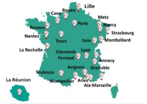 Marseille (13), Caen (14), Aurillac (15), La Rochelle (17), Montpellier (34), Rennes (35), Dole (39), Nantes (44), Lille (59), Clermont-Ferrand (63), Strasbourg (67), Paris (75).
