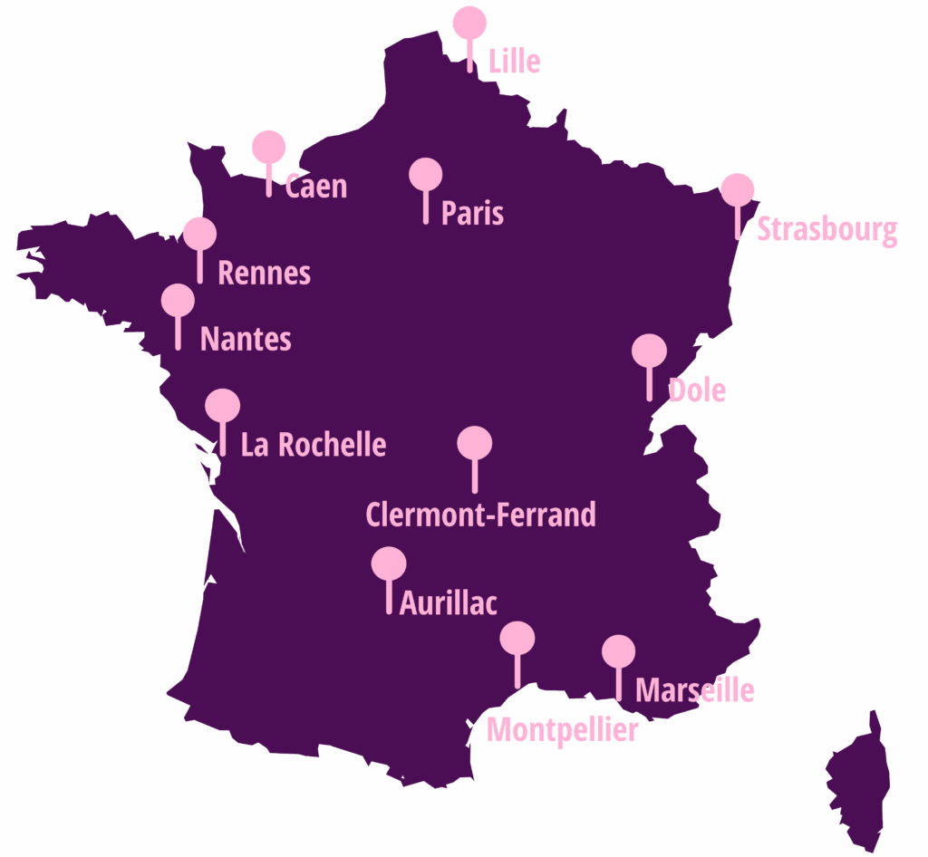 Marseille (13), Caen (14), Aurillac (15), La Rochelle (17), Montpellier (34), Rennes (35), Dole (39), Nantes (44), Lille (59), Clermont-Ferrand (63), Strasbourg (67), Paris (75).